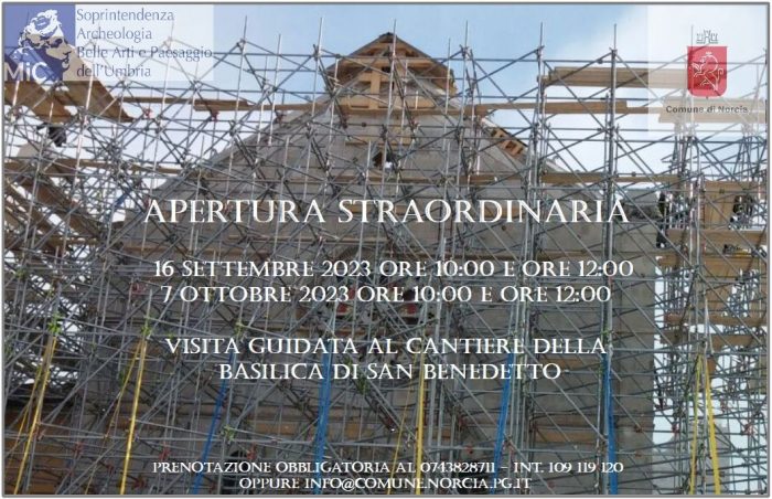 L’iniziativa – in collaborazione tra Ministero della Cultura, Soprintendenza Umbria, Comune di Norcia e Ditta appaltatrice – prevede due appuntamenti per sabato 16 Settembre e sabato 7 Ottobre, con due scaglionamenti previsti su prenotazione obbligatoria e gratuita: un primo gruppo composto da massimo 25 persone alle ore 10:00 e un secondo gruppo di massimo 25 persone alle ore 12:00.